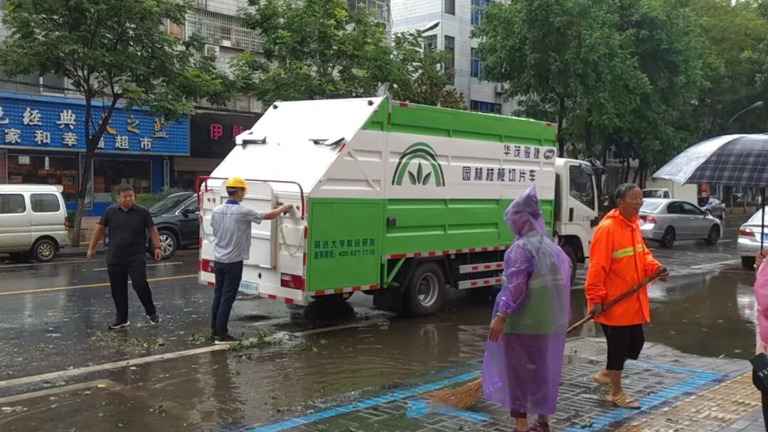 万幸的是车辆及时到位,救援现场的树已被连根拔起,断枝落叶遍地散布。救援队成员赶紧下车,与园林工人一起冒雨将断枝落叶弄到路边,雨水浇湿全身、鞋里进水,他们仍不停歇。清理好断枝落叶,陈帅开启了园林枝桠切片车作业模式,然后救援队和园林工人们一起搬着被雨打湿的树枝填进进料口,只一眨眼的功夫,断枝落叶被切削成小颗粒,送进了车厢里。路过的市民对这个神奇装备感到惊叹:碗口粗的树干它都能切碎!一名热心市民还拍下了视频,发给了园林日报。20分钟过去,拦路的一堆断枝落叶被清理干净,路面洁净畅通。